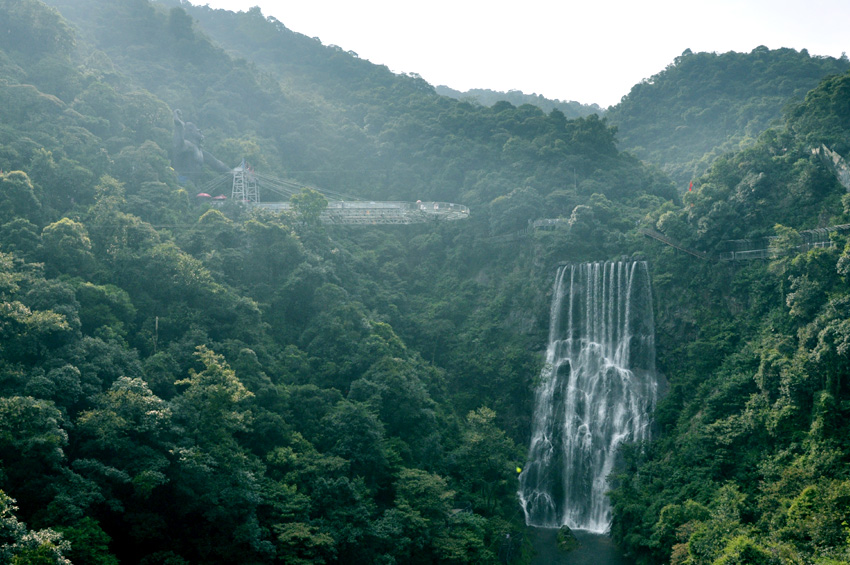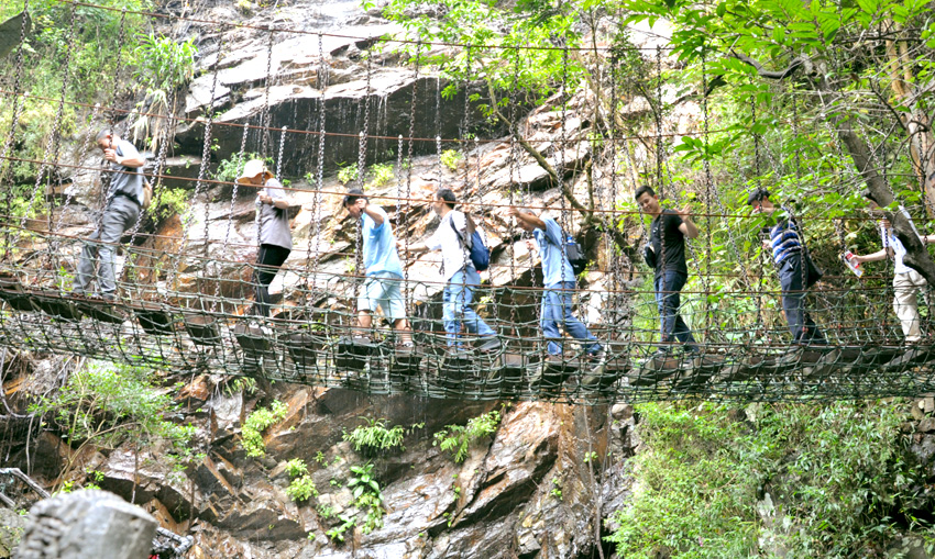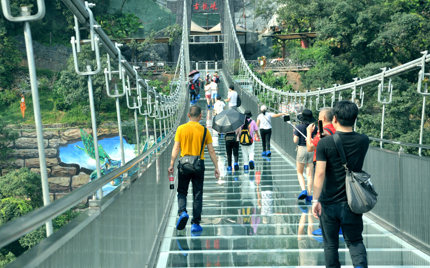 两小时的小北江之游,大家都还余味未尽。导游又带上大家赶往这次团建活动的重头戏的目的地:古龙峡的“云天波霸”。今天公司参加团建的所有员工都要挑战目前世界上较宽的高空玻璃桥,玻璃桥像一条通体透明的巨龙连接着峡谷两岸,桥下悬空超过100米,站在桥上向下看,真是令人心惊胆战,大家相互鼓励,三三两两牵手前行,用相互的关爱顺利通过并成功抵达世界较大直径的悬空玻璃平台。尽管大家都汗流浃背,但每个人脸上都洋溢着喜悦。因为此时大家都收获了克服恐惧心理后战胜困难的勇气和成功!
