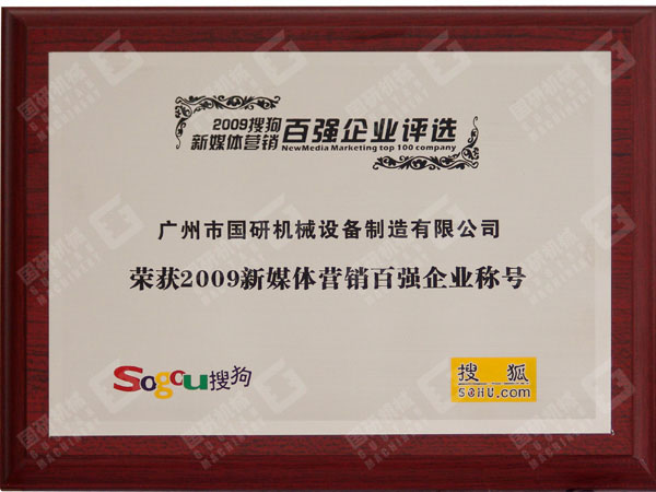 新年伊始,广州市国研机械设备制造有限公司再度传来喜讯:在搜狗与搜狐财经、搜狐IT共同举办的“2009搜狗新媒体营销百强企业评选”活动中,广州市国研机械设备制造有限公司凭借出色的网络营销案例成功晋级,与各行业众多一线品牌企业一同荣获“2009新媒体营销百强企业”称号。